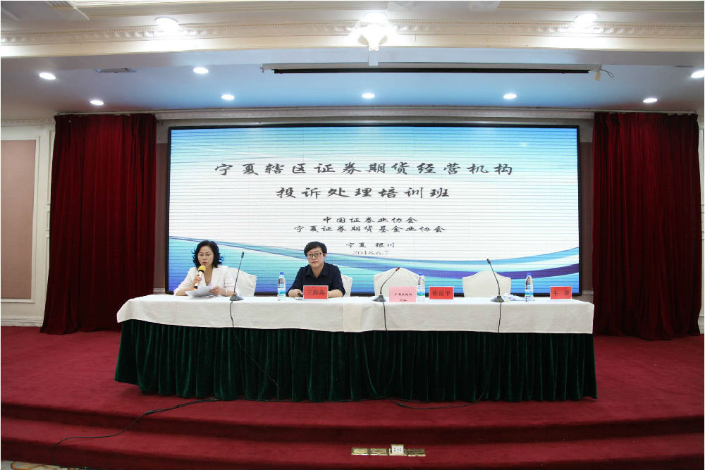 为促进宁夏辖区证券经营机构完善投诉处理机制,提高客户服务人员和投诉处理人员的纠纷处理能力,中国证券业协会与宁夏证券期货基金业协会于2018年6月7日在宁夏银川联合举办“宁夏辖区证券经营机构投诉处理培训班”。各证券期货经营机构共115人参加了培训。