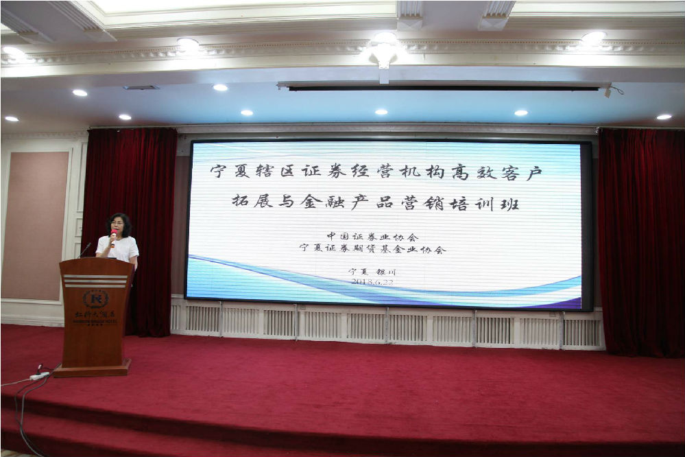为帮助宁夏辖区证券经营机构推进经纪业务转型,交流实践经验,提升综合金融服务能力, 中国证券业协会与宁夏证券期货基金业协会于2018年6月22日联合举办“宁夏辖区证券经营机构高效客户拓展与金融产品营销培训班”。各证券期货经营机构共102人参加了培训。