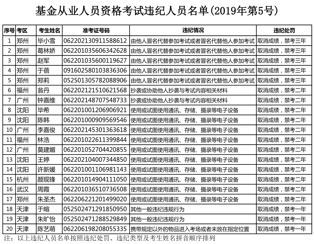 基金从业人员资格考试违纪人员名单(2019年第5号)