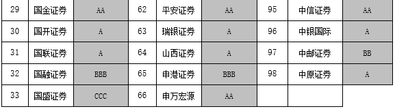 注:全行业132家公司中,有34家公司按规定与其母公司合并评价,即:高盛高华(母公司北京高华),渤海汇金(渤海证券),长江保荐、长江资管(母公司长江证券),财通资管(母公司财通证券),一创投行(母公司第一创业),东证融汇(母公司东北证券),东证资管、东方投行(母公司东方证券),瑞信方正、方正承销保荐(母公司方正证券),光证资管(母公司光大证券),广发资管(母公司广发证券),华英证券(母公司国联证券),国盛资管(母公司国盛证券),国君资管、上海证券(母公司国泰君安),海通资管(母公司海通证券),恒泰长财(母公司恒泰证券),华泰联合、华泰资管(母公司华泰证券),摩根士丹利华鑫(母公司华鑫证券),中泰资管(母公司中泰证券),中德证券(母公司山西证券),申万宏源承销保荐、申万宏源西部(母公司申万宏源),兴证资管(母公司兴业证券),银河金汇(母公司银河证券),招商资管(母公司招商证券),浙商资管(母公司浙商证券),中金财富(母公司中金公司),中信证券(山东)、金通证券、中信证券华南(母公司中信证券)。