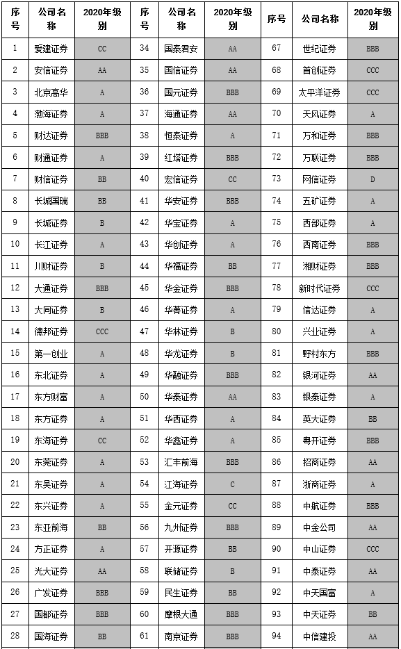 2020年证券公司分类结果如下(按公司名称拼音顺序排序):