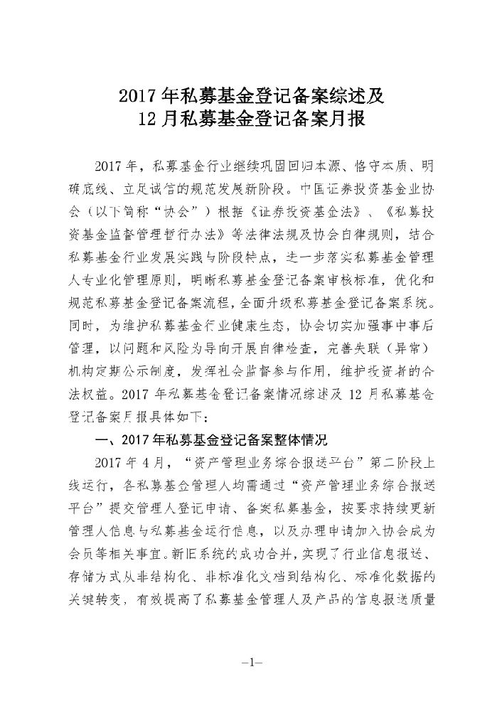 2017年私募基金登记备案综述及12月私募基金登记备案月报