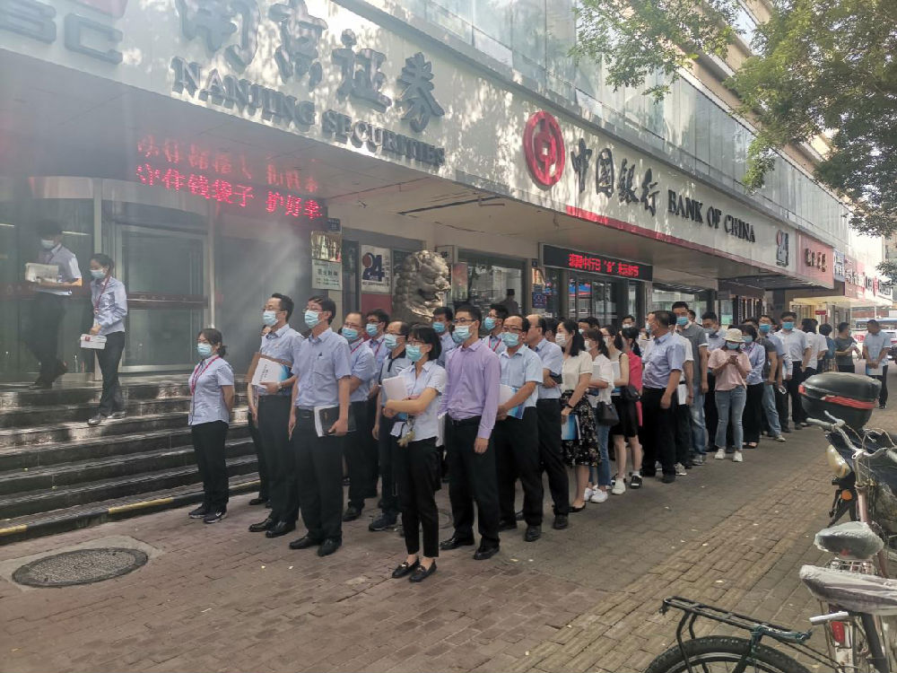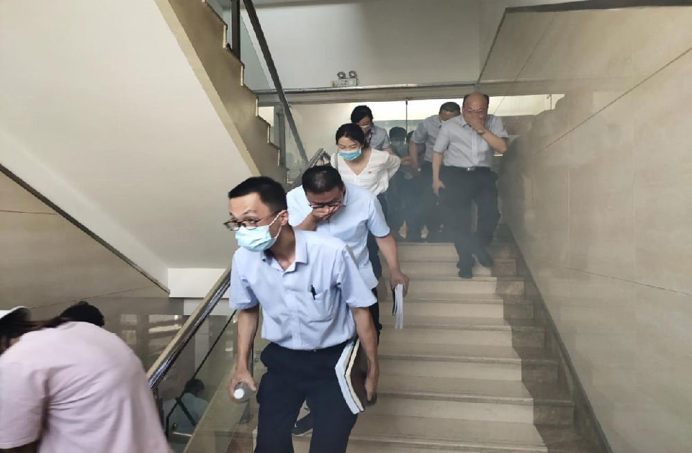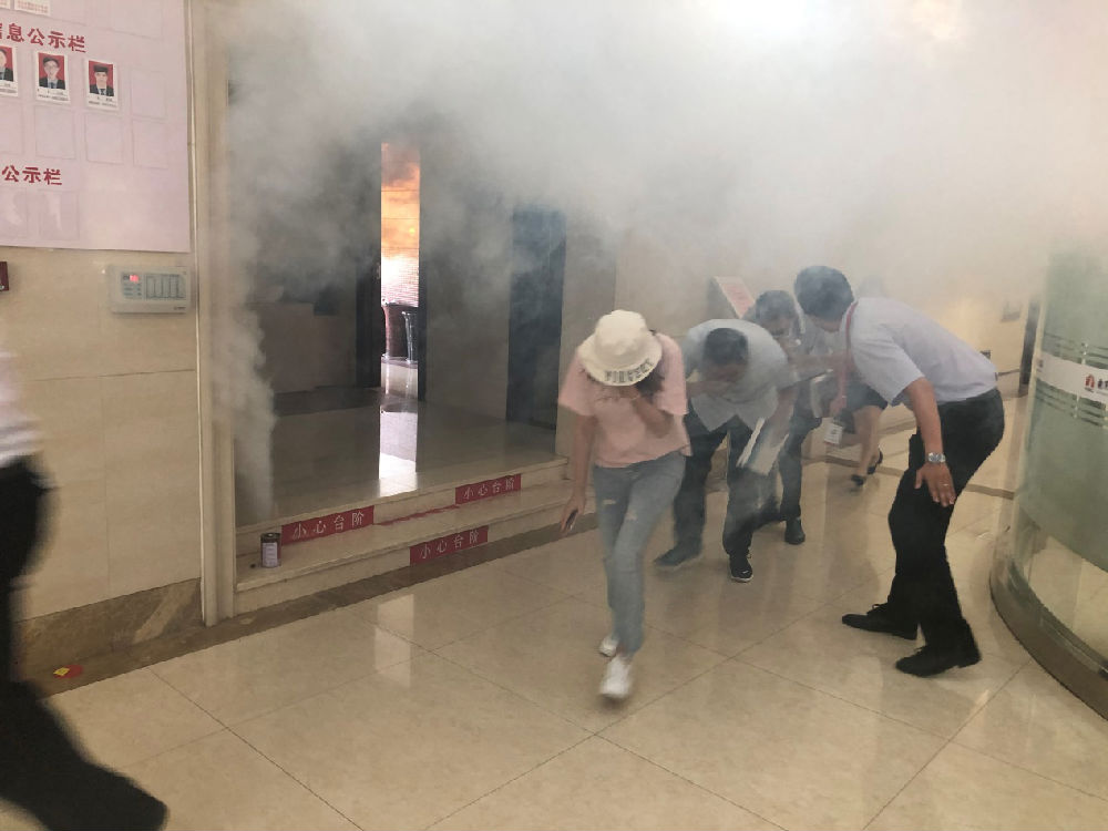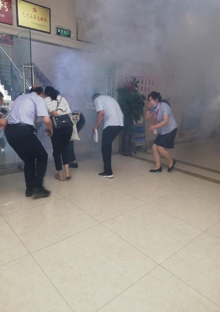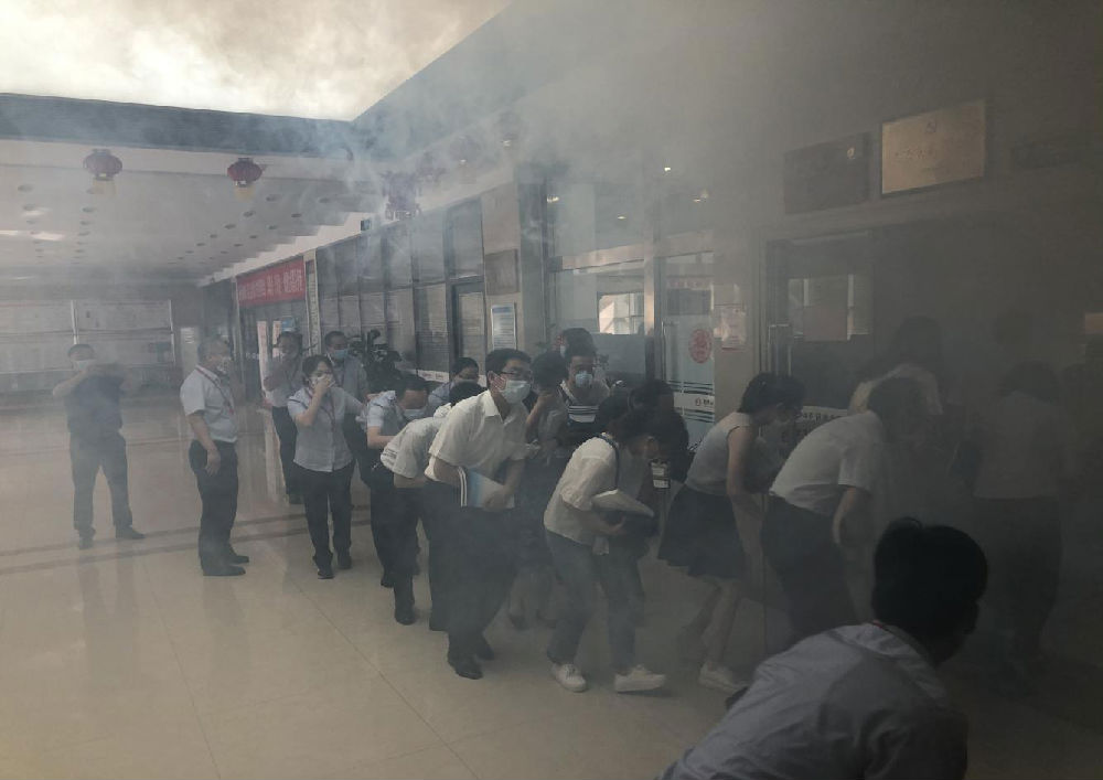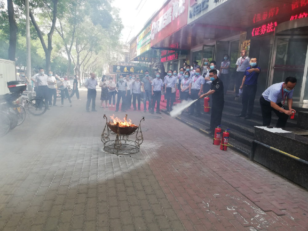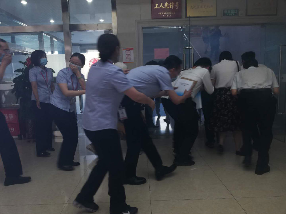 随后协会组织参会人员观摩了南京证券银川民族北街营业部消防应急演练。随着总指挥下达了演练开始的指令,营业部发生火情,现场硝烟弥漫,警报响起,广播组立即进行广播通知,营业部灭火组成员迅速组织进行初级灭火,报警组成员向119拨打报警电话,观摩人员在营业部疏散组成员和安保人员的组织下,弯着腰,戴着口罩,用手、袖口等捂住口鼻,穿过浓烟,按照疏散路线快速、有序地从安全通道向室外安全区域疏散。疏散人员到达安全区域后,指挥现场立即清点了人数,并向上级主管部门进行了汇报。演练活动紧张有序,顺利结束。