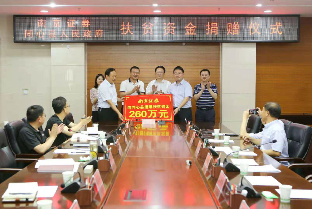 7月24日,南京证券向国家级贫困县、少数民族地区宁夏同心县捐赠资金,用于在该县兴隆乡最大贫困村李堡村建设现代高效设施农业蔬菜大棚,以实际行动帮助当地壮大村集体经济,全力打赢脱贫攻坚战。南京证券党委书记、董事长步国旬和吴忠市委常委、同心县委书记马洪海分别致辞。宁夏证监局纪委书记李鸿博,南京证券副总裁、党委委员夏宏建,宁夏金融局,同心县及李堡村,南京证券有关部门、分支机构和子公司负责同志参加活动。