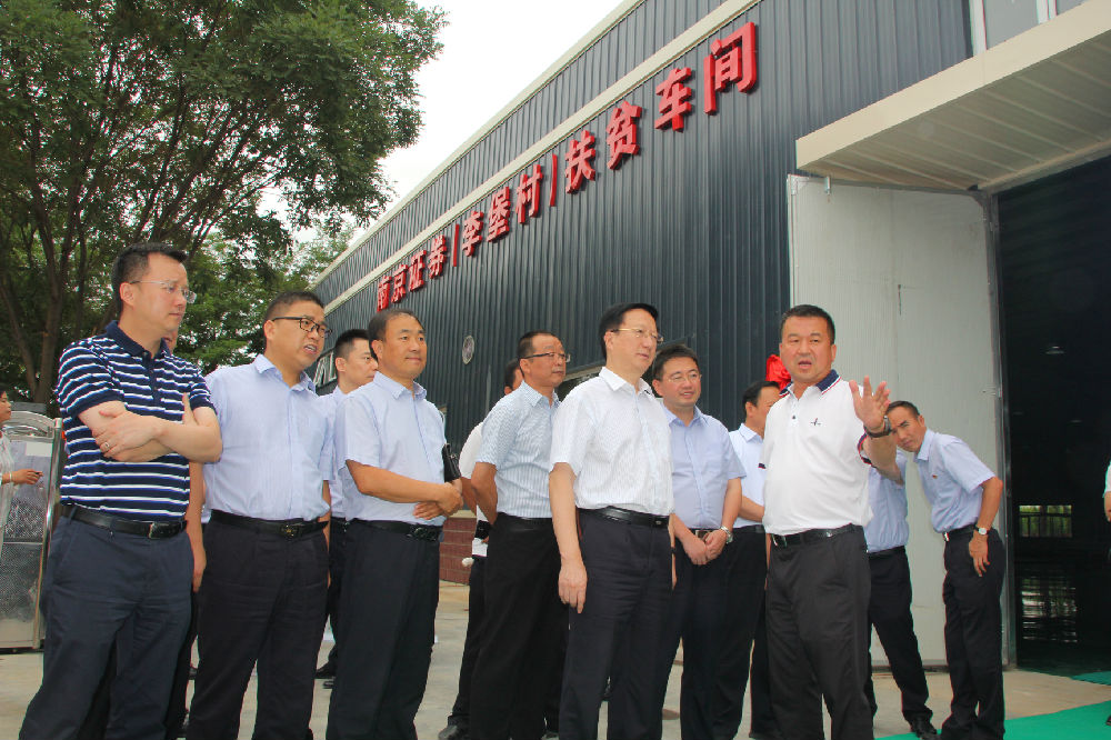 当天上午,步国旬一行冒着酷暑到李堡村实地调研南京证券去年捐建的就业扶贫车间情况,并为车间揭牌。目前车间正式建成并交工,帮助引进的福州邦基贸易公司已入驻,步国旬察看车间各项设施,与车间员工进行交流,勉励车间负责同志认真做好人员培训等相关事宜,尽快实现车间投产,帮助当地村民实现家门口就业。在李堡村现代高效设施农业蔬菜大棚建设现场,步国旬详细了解大棚规划及建设情况,并到王团村实地参观了解现代高效设施农业蔬菜大棚运营情况。步国旬还走访慰问李堡村贫困户,为他们送上慰问金,走近羊圈牛棚了解贫困户生产生活情况,鼓励他们通过奋斗创造幸福生活。