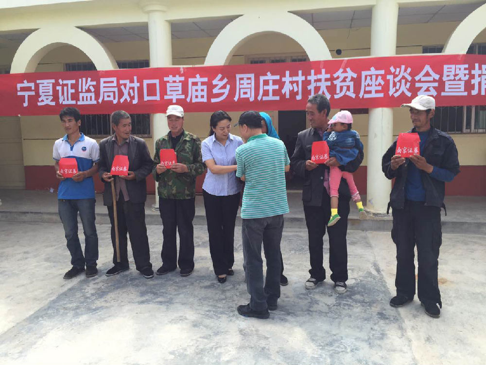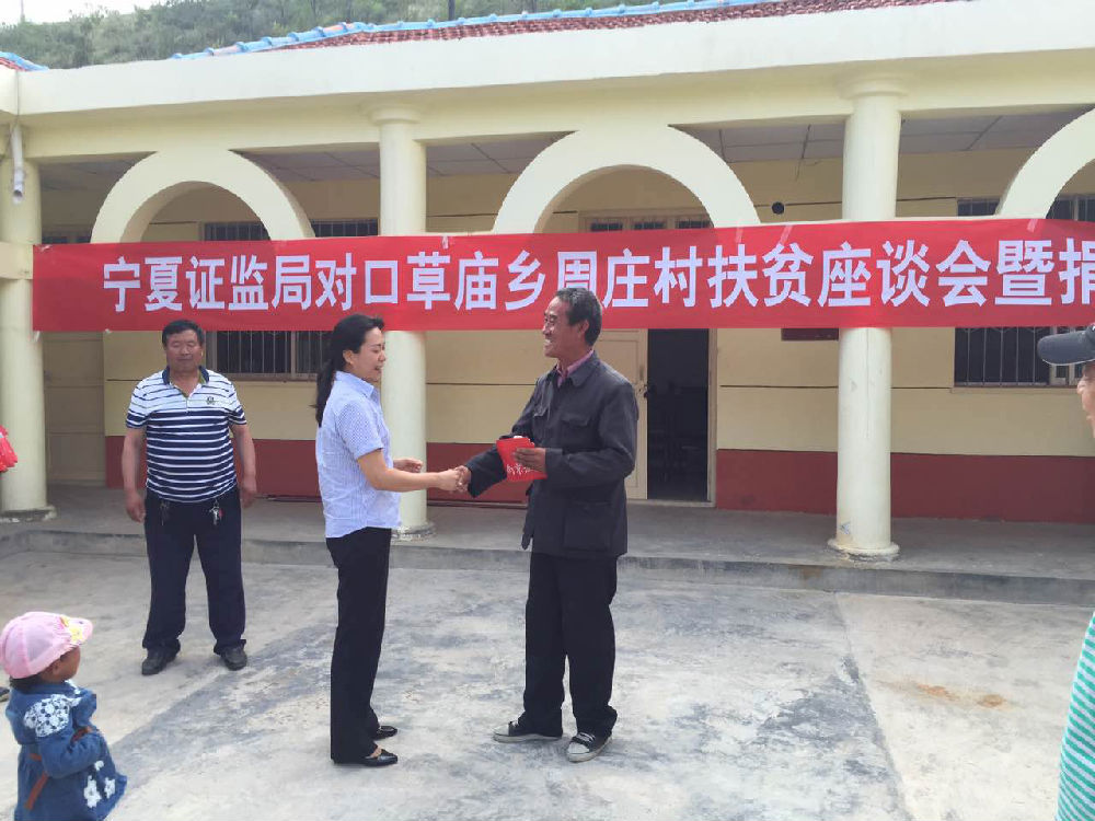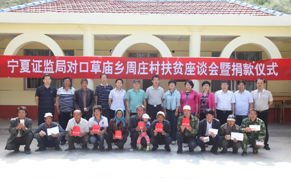 2014年,宁夏证监局响应政府号召,与彭阳县草庙乡周庄村建立了对口帮扶关系,协调辖区证券期货经营机构积极参与,多方筹措资金开展帮扶活动。将精准扶贫和“造血”扶贫相结合,一方面在扶贫村民生发展上提供力所能及的帮扶,尽力解决贫困人口的生活困难;另一方面积极推动全县企业利用资本市场直接融资,促进优势产业发展,从根本上带动整个区域贫困人口脱贫致富。