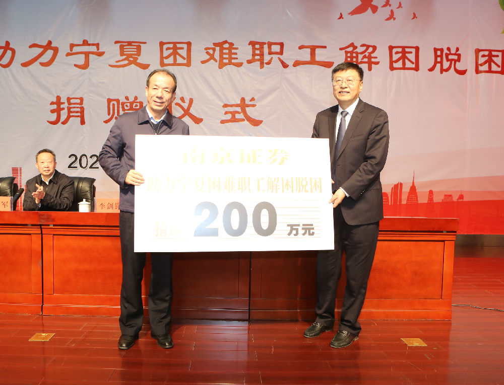 捐赠仪式上,李剑锋代表南京证券向自治区总工会捐赠资金,马利明代表自治区总工会接受捐赠。所捐款项将用于对宁夏地区困难职工进行帮扶救助,以进一步落实精准扶贫举措,帮助宁夏地区困难群众改善生活。