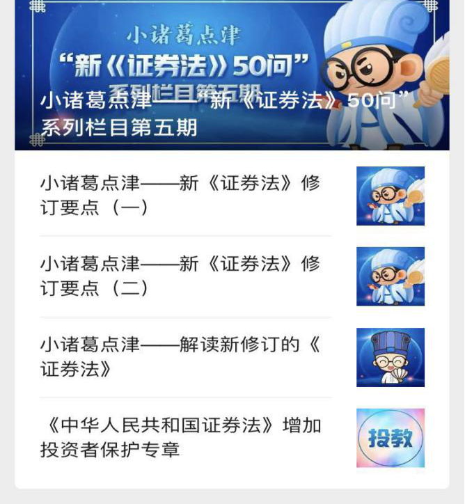 营业部自3月10日开始,高度重视此次活动。营业部负责人牵头部署,组织全体员工通过多种渠道进行本次新《证券法》系列活动预热:向客户发送申万宏源证券大赢家订阅号“新《证券法》50问”(共5期,每期10问)、“小诸葛点津解说新《证券法》”、“佳佳点金”等宣传推文,用图文并茂的内容引导投资者快速熟悉新《证券法》修订的相关内容,特别是深入了解和学习投资者?;ぷㄕ碌认喙啬谌?;