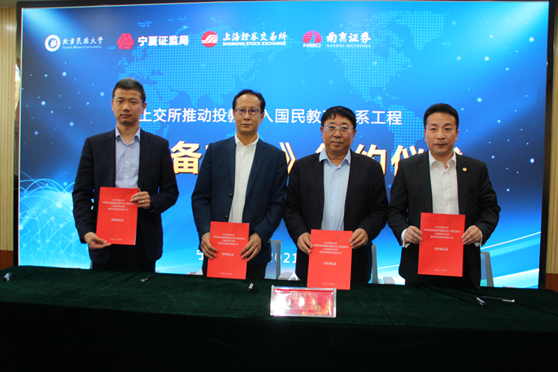 4月27日下午,宁夏证监局、上海证券交易所、南京证券与北方民族大学共同签署《推动投资者教育纳入国民教育体系合作备忘录》,通过合作互建“投资者教育实践基地”和“金融专业人才培养实践教学基地”等模式,推动证券金融知识融入相应课程教材并纳入学分体系,拓宽延伸大学生的理论学习与实践范围,联合开展有关证券期货新课题的科研教学。