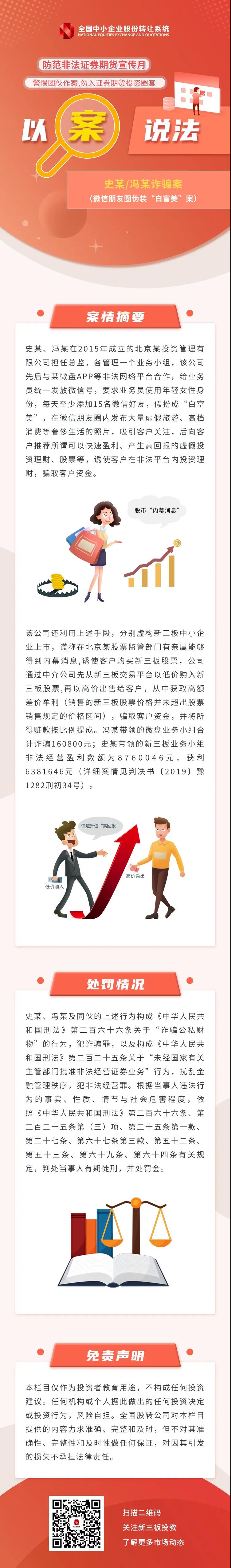 【编者按】近年来,屡有不法分子冒充正规证券经营机构,通过社交软件、相亲网站等渠道,散布虚假“消息”,以高额投资收益诱骗投资者通过非正当途径购买新三板股票,导致投资者遭受损失。全国股转公司投教基地根据近期收集的已宣判案件,提示投资者甄别非法证券活动,有效识别风险,合规参与市场。