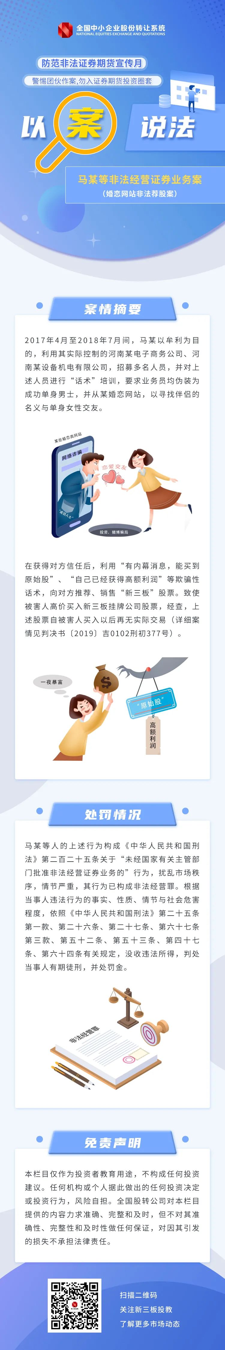 【编者按】近年来,屡有不法分子冒充正规证券经营机构,通过社交软件、相亲网站等渠道,散布虚假“消息”,以高额投资收益诱骗投资者通过非正当途径购买新三板股票,导致投资者遭受损失。全国股转公司投教基地根据近期收集的已宣判案件,提示投资者甄别非法证券活动,有效识别风险,合规参与市场。
