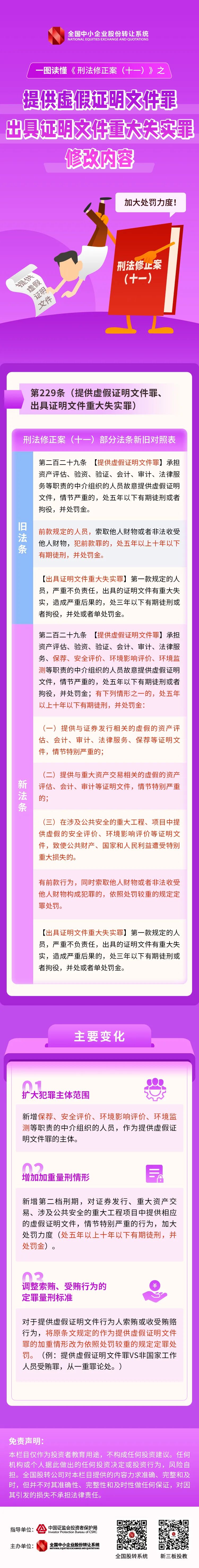 2021年3月1日起,《中华人民共和国刑法修正案(十一)》(以下简称《刑法修正案(十一)》)正式施行。《刑法修正案(十一)》对涉及资本市场的欺诈发行、信息披露违法、操纵市场、提供虚假证明文件等犯罪行为的罪名适用对象、犯罪行为的表现、刑事处罚标准等方面进行了更加明确的规定。为贯彻证监会关于加强《刑法修正案(十一)》学习宣传的工作要求,全国股转公司制作了一图读懂《刑法修正案(十一)》系列学习材料,欢迎广大投资者参考、学习。