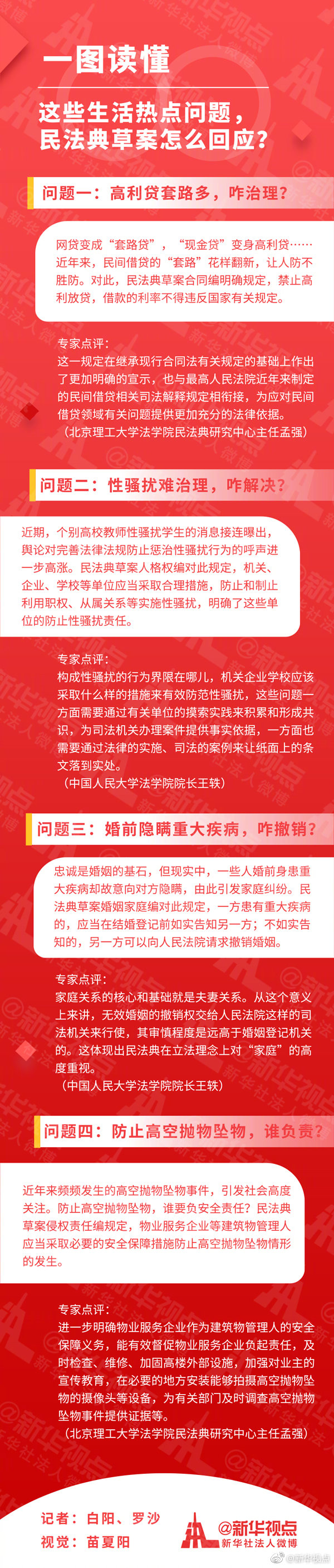 由民法典各分编草案与民法总则“合体”而成的民法典草案,23日于十三届全国人大常委会第十五次会议上亮相。明确禁止高利放贷、完善防止性骚扰有关规定、合理确定无效婚姻的情形、完善高空抛物坠物责任规则......这些生活中的热点问题,民法典草案都予以明确回应。