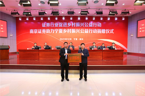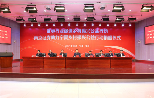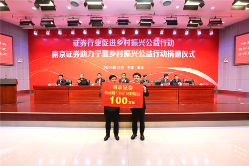 为深入贯彻落实党中央、国务院关于巩固拓展脱贫攻坚成果,全面推进乡村振兴的决策部署,响应中国证监会、中国证券业协会号召,12月17日,南京证券在银川举行“证券行业促进乡村振兴公益行动——南京证券助力宁夏乡村振兴公益行动”捐赠仪式,向宁夏回族自治区总工会、国家乡村振兴重点帮扶县同心县和海原县、北方民族大学合计捐赠420万元助力乡村振兴帮扶资金。