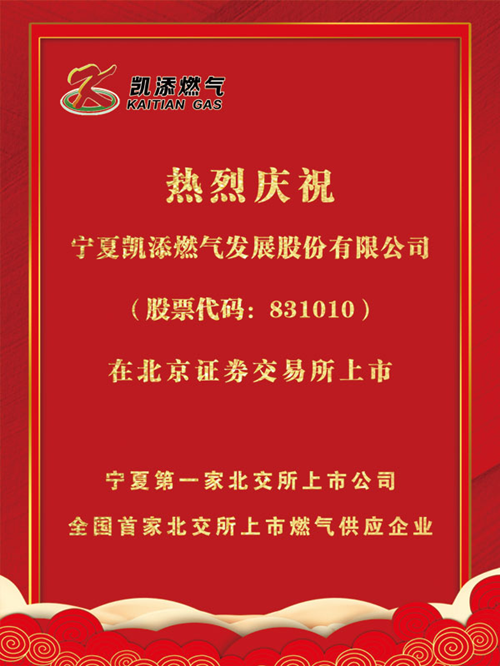 2021年11月15日,北京证券交易所开市,宁夏凯添燃气发展股份有限公司作为全国首批企业登陆北交所,成为宁夏第一家北交所上市公司,全国首家在北交所上市的燃气供应企业。