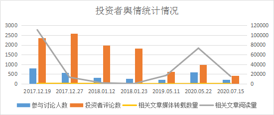 经统计,自龙力生物2017年回应媒体所报道的债务违约事件为起点至进入退市程序,投资者参与讨论人数和相关文章阅读量呈现逐步减少的趋势,并于2020年5月22日即龙力生物终止上市并摘牌这一时点小幅反弹后继续减少??杉死嗤耸性谑录⒔统跏级酝蹲收叩某寤骷?,但后续由于公司久病沉疴、积重难返,董监高大幅减持,投资者的信心快速流失,加之缺乏维权手段,对相关事件的关注度同步降低。