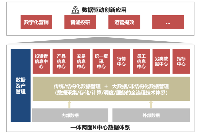 为更好地推动数据赋能业务,敏捷响应用户的公共和个性化需求,基于大数据平台打造了“N”个数据服务中心,目标是通过汇聚公司数据资产,广泛整合内、外部数据,形成统一的数据底座,逐步实现数据打通共享,支持数字营销、智能投研、运营提效等应用,促进数据要素价值释放。