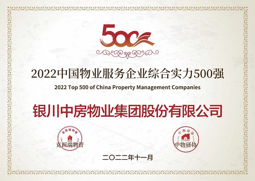 11月1日,在中物研协、克而瑞物管隆重发布《2022中国物业服务企业综合实力500强》荣誉榜单,银川中房物业居全国159位,在宁夏排名第一,西北区域排名第一,名次较2021年度有序上升。