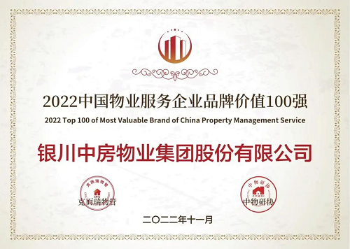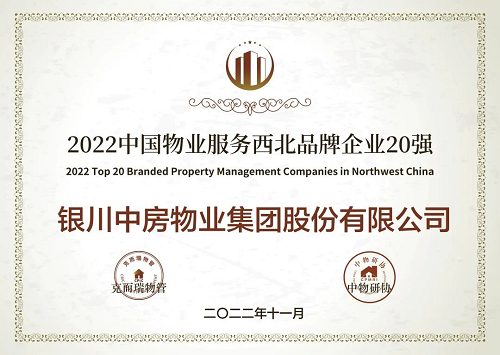 银川中房物业同时上榜《2022中国物业服务企业品牌价值100强》《2022中国物业服务西北品牌企业20强》。