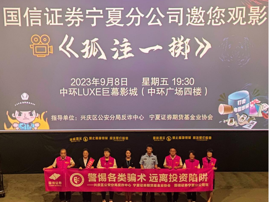 为进一步提高广大投资者的风险防范意识,扎实做好投资者教育工作,国信证券宁夏分公司在银川市兴庆区公安分局反诈中心、宁夏证券期货基金业协会指导下,于9月8日开展了以“警惕各类骗术,远离投资陷阱”为主题的反诈宣传暨投资者观影活动。