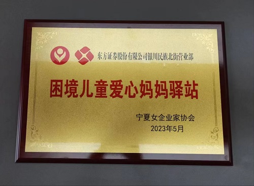 5月13日,在宁夏女企业家协会“温暖母亲节,接力传递爱”活动中,东方证券银川营业部被授予“困境儿童爱心妈妈驿站”称号。这也为东方证券银川营业部持续开展困境儿童关爱增添了一份沉甸甸的责任。东方证券营业部将积极履行“困境儿童爱心妈妈驿站”公约,尽我们的力量,和社会爱心人士一起为孩子们提供基本的生活保障,多关心孩子们,让孩子们感受爱意和温暖。