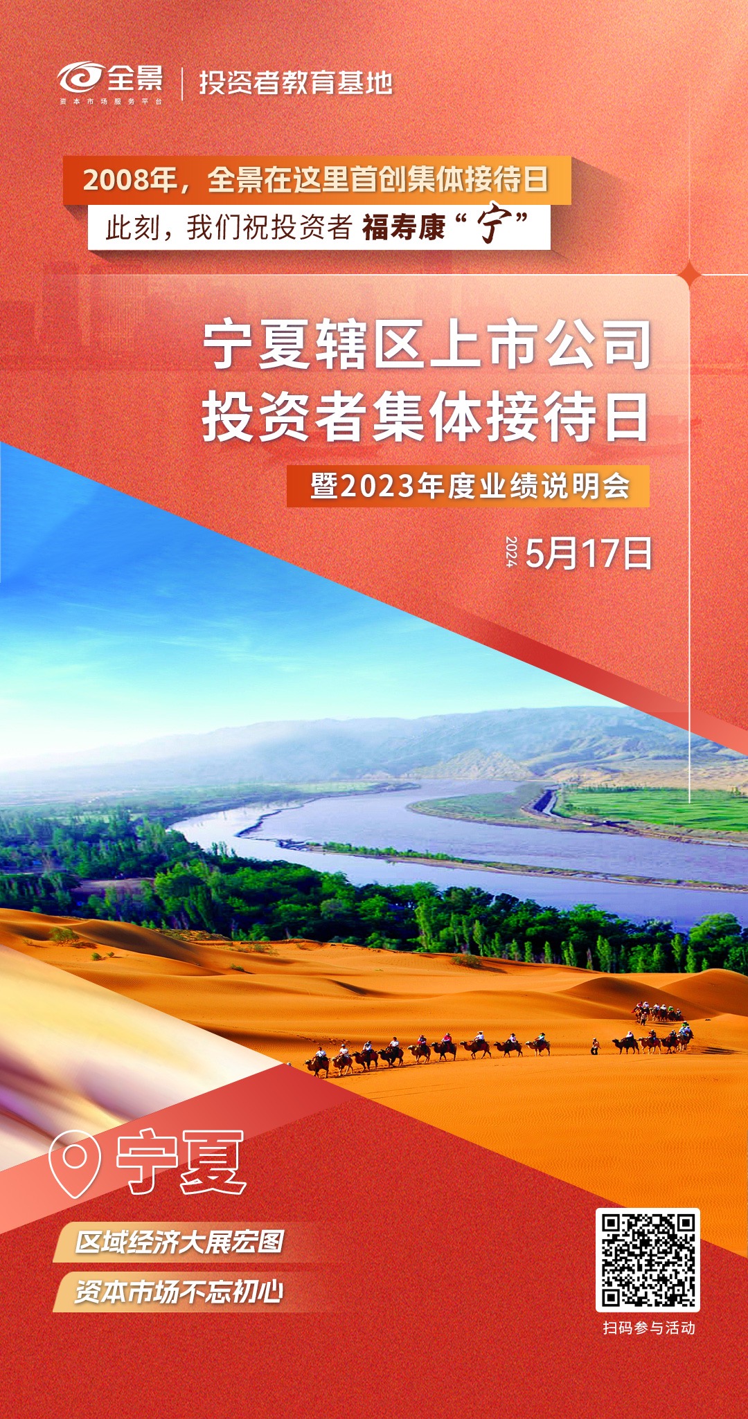 宁夏辖区上市公司投资者集体接待日暨2023年度业绩说明会将于2024年5月17日14:00—17:00在全景网举行,辖区17家A股上市公司逾百位高管将共同参与这场盛会。