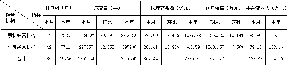 截至4月末,累计开设证券账户(A、B股账户)275.93万户,环比增幅0.28%,其中A股证券账户275.74万户,环比增幅0.28%。累计开设资金账户150.97万户,环比增幅0.32%。